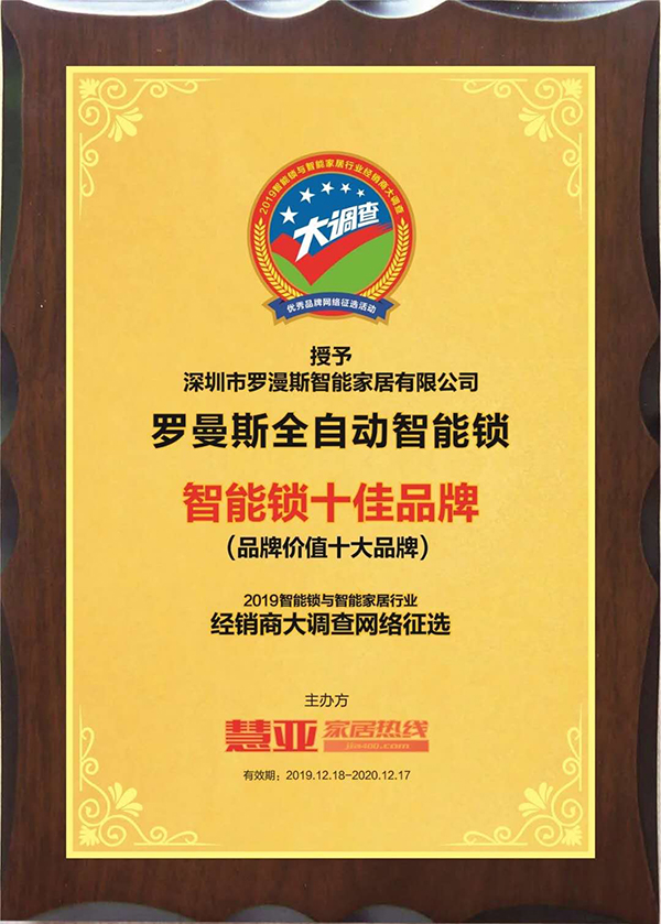 ? ? ? 近日,由慧亞家居熱線主辦的2019智能鎖與智能家居經銷商大調查優秀品牌網絡征選結果公布。羅曼斯在150個參選品牌中脫穎而出,榮獲智能鎖十大品牌(品牌價值十大品牌)獎項。